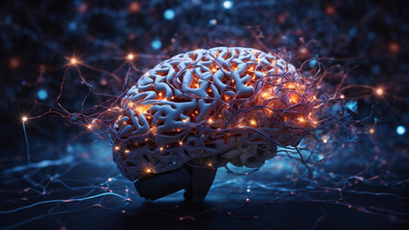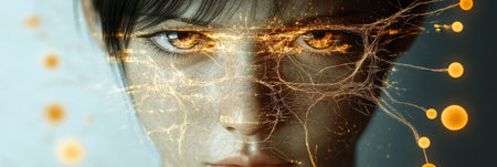 An artistic illustration presents a complex network of interconnected nodes and lines, suggesting neural pathways. Golden spheres and light elements create a visually engaging display against a dark background. The composition, rendered in a digital style, could be suitable for various applications, including scientific publications and design projects.