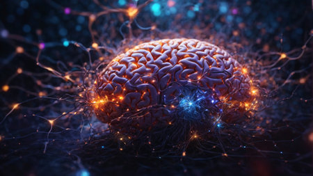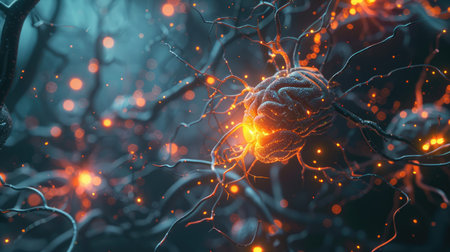 An AI generated illustration of brain neuron with its center illuminated by a glowing orange light