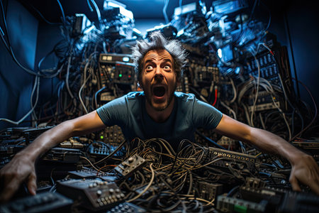 Furious expression in the face of a chaotic technological collapse., generative AI