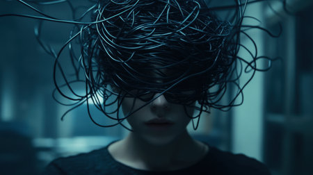 A person's thoughts and emotions are like a jumbled mess, representing the chaos of anxiety. Generative AI