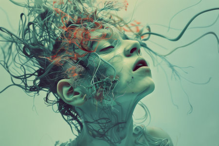 A mesmerizing abstract image featuring a human profile silhouette with luminous eyes and intricate, organic structures emanating from the head, symbolizing complex thought and creative energy within