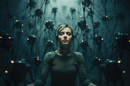 Cuttingedge futuristic brain interface experiment, a hightech neural connection technology with wires. Electrodes. And ai for closeup brainwave monitoring and healthcare diagnostics