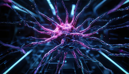 A close-up depiction showcases interconnected neuron cells with glowing nodes and radiating pathways. The artwork features bright blue and purple hues against a dark background. This digital illustration could be used in scientific publications, educational materials, or presentations related to biology and technology.