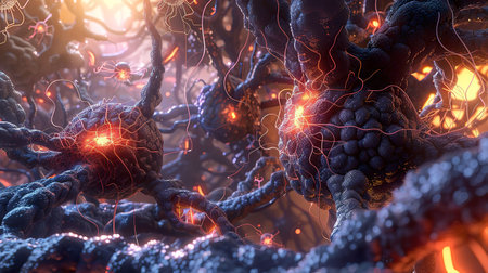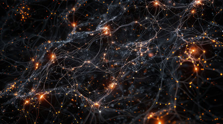 A captivating abstract depiction of neural network connections featuring glowing synapses against a dark background. Ideal for topics related to technology and science.