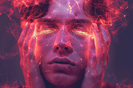 A young man's face glows with colorful lights, symbolizing digital neural connections in a captivating display.