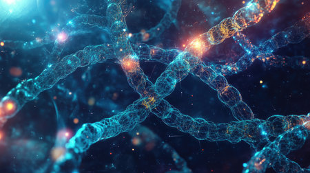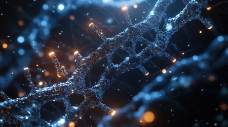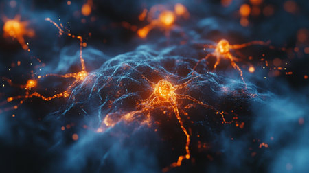 An artistic depiction presents a network of interconnected nodes and lines, resembling a complex biological structure. The composition utilizes a dark background to highlight glowing orbs and pathways in shades of blue and orange. This visualization is suitable for applications in science, technology, and design.