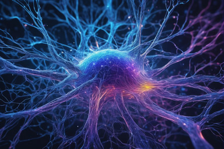 Neural network connections shown with bright colors and glowing synapses in a futuristic artistic style