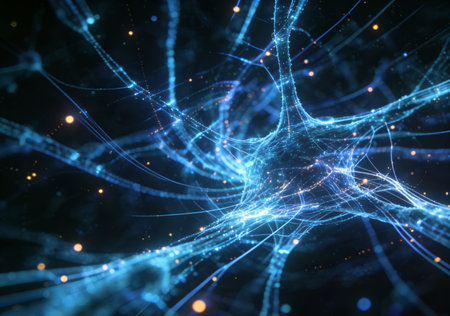 This mesmerizing image features an intricate network of neurons and synapses, illuminated by vibrant orange and blue hues, encapsulating the beauty of biological connections.