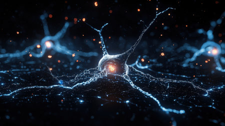 Close-up of neurons firing in a brain, glowing synapses connecting, with a dark background and room for text.