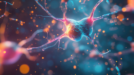 Stunning visualization of neurons and synaptic connections in vivid colors, showcasing the complexity of neural communication and the beauty of biological structures.