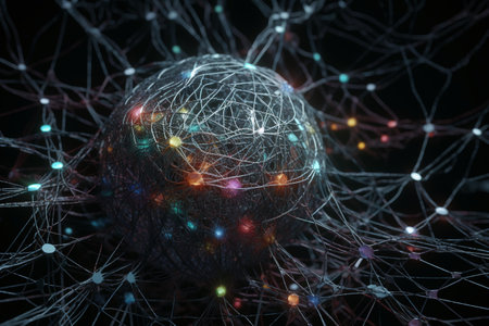 An artistic illustration presents a complex network of interconnected nodes and lines, suggesting neural pathways. Golden spheres and light elements create a visually engaging display against a dark background. The composition, rendered in a digital style, could be suitable for various applications, including scientific publications and design projects.