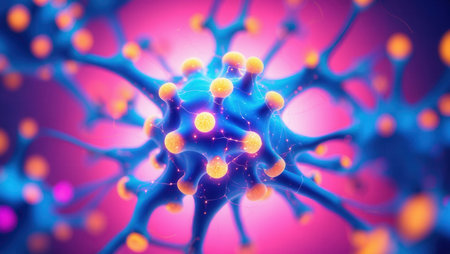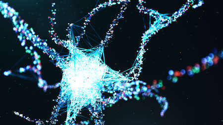 3d illustration of neuron cell with glowing particles, computer generated abstract background