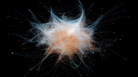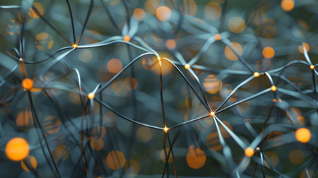 Stunning abstract depiction of a neural network showcasing glowing orange nodes, intricately connecting against a dark background, symbolizing complexity.