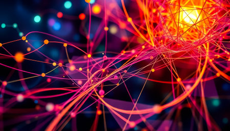 Vivid abstract representation of network connections featuring neon lights. Ideal for technology, digital art, and science concepts, creating a futuristic atmosphere.