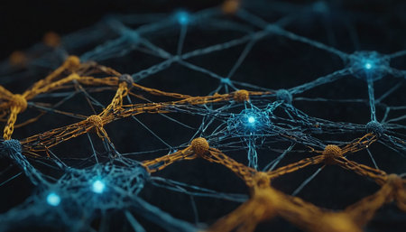Complex web of interconnected nodes represents a neural network, glowing against a dark background.
