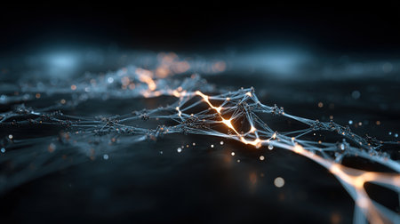 A dark, abstract image showcases a complex network of glowing, interconnected lines and nodes, resembling a neural pathway or digital circuit, set against a blurred, dark background.