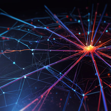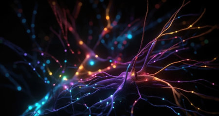 This vibrant abstract image showcases a network of glowing neurons and connections, symbolizing the complexity and beauty of technology and biology in motion.