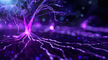 This vivid abstract image showcases glowing neural connections in rich purple tones, creating a captivating interplay of light and depth against a dark backdrop.