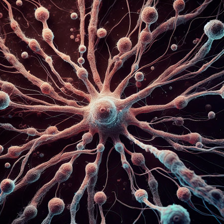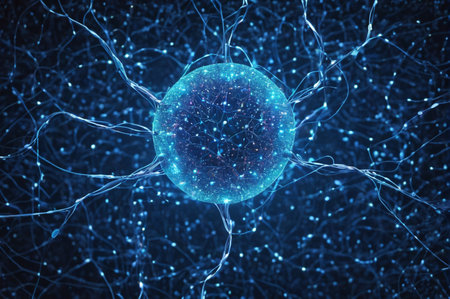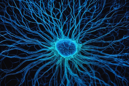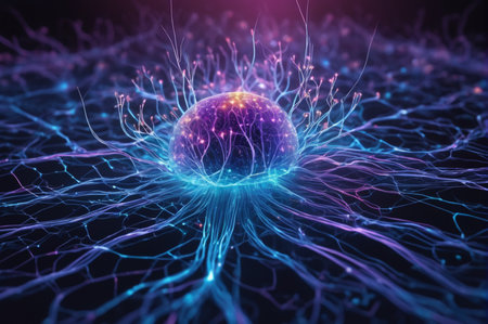 A glowing radial nerve network radiates from a central point, showcasing vibrant connections and bioelectric activity.