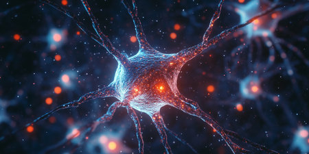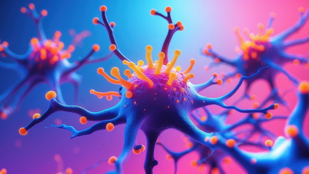 Abstract depiction of neural cells with glowing orange connections, set against a vibrant blue and pink gradient background, symbolizing neuroscience concepts.