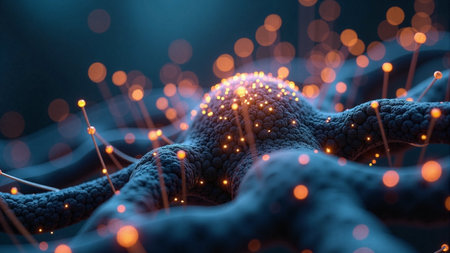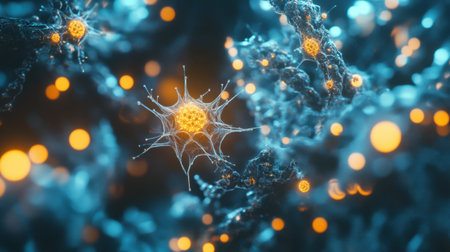 An artistic depiction presents a network of interconnected nodes and lines, resembling a complex biological structure. The composition utilizes a dark background to highlight glowing orbs and pathways in shades of blue and orange. This visualization is suitable for applications in science, technology, and design.