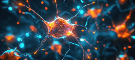 This mesmerizing image features an intricate network of neurons and synapses, illuminated by vibrant orange and blue hues, encapsulating the beauty of biological connections.