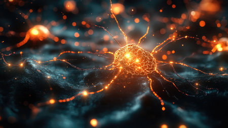 An AI generated illustration of brain neuron with its center illuminated by a glowing orange light