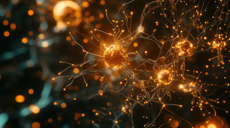 Interconnected neurons with glowing synapses, illustrating the science of neuronal communication and brain activity.