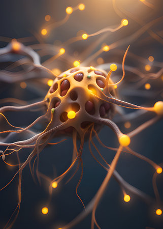 3d rendering of neuron cell with glowing particles, computer generated abstract background