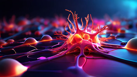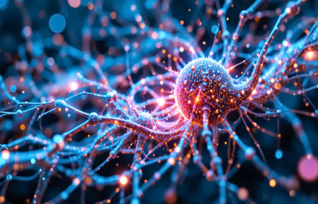 AI Generated. Vibrant neural cell surrounded by particles a cinematic exploration of depth and creativity