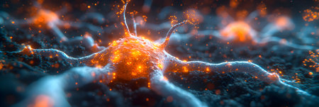 An abstract representation of glowing neurons and synapses, showcasing intricate connections in vibrant blue and orange tones. Perfect for science and technology themes.