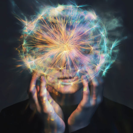 A person holds their head with hands, surrounded by vibrant, swirling colors and light patterns, symbolizing creativity and mental exploration