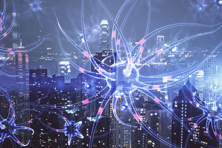 Double exposure of neuron drawing icon and cityscape background. Concept of education.