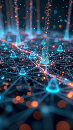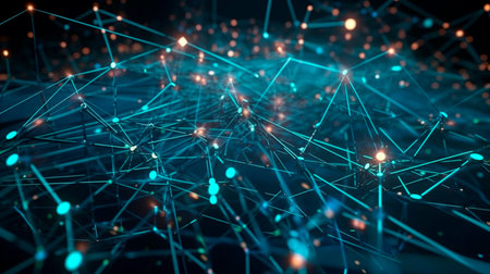 This abstract image showcases a digital network with glowing nodes and interconnected lines, creating a beautiful representation of connectivity in technology.