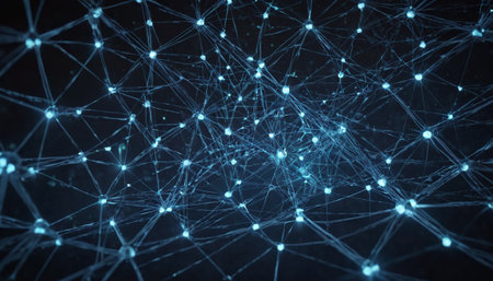 A complex web of interconnected nodes and lines glows in shades of blue, with scattered bright points illuminating the dark background, creating a futuristic digital landscape.