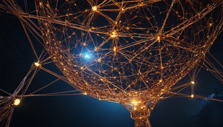 A mesmerizing network of luminous nodes and interconnected lines spreads across a dark background, creating a captivating visual representation of unity and complexity in the universe.