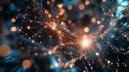 Complex web of interconnected nodes represents a neural network, glowing against a dark background.