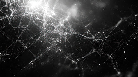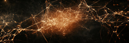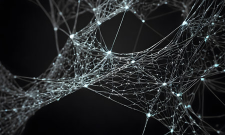 A dark, abstract image showcases a complex network of glowing, interconnected lines and nodes, resembling a neural pathway or digital circuit, set against a blurred, dark background.