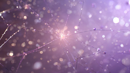 An ethereal macro photograph captures a spiderweb adorned with droplets of water, illuminated by soft, diffused light. The composition highlights the web's intricate structure, complemented by a blurred background of bokeh circles in shades of purple and white. This image is suitable for various commercial purposes, including website backgrounds and decorative designs.