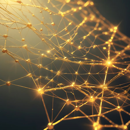 An abstract visualization of a golden network composed of interconnected spheres and fine lines. The spheres are illuminated, emitting a bright, warm light that creates a glowing effect. The lines form a complex, web-like structure, suggesting a system of connections or data flow. The background is dark and slightly blurred, with subtle light effects that enhance the ethereal and futuristic feel of the image.