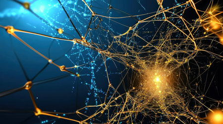This stunning abstract image showcases intricate neural network connections glowing in a dynamic interplay of blue and gold, symbolizing innovation and creativity.