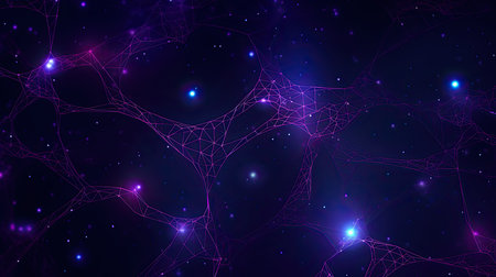 A mesmerizing network of luminous nodes and interconnected lines spreads across a dark background, creating a captivating visual representation of unity and complexity in the universe.