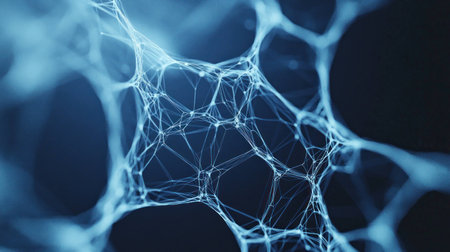 This abstract image showcases a network of glowing blue connections against a dark backdrop, representing dynamic interactions and molecular structures in technology and science.