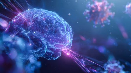 This artwork features a detailed brain against a colorful, abstract background depicting neural patterns.