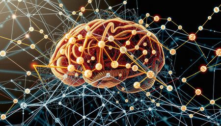 This illustration depicts a brain with interconnected neural networks, featuring blue and red hemispheres