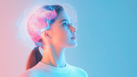 A conceptual image showing the human mind syncing with a digital network—AI and neuroscience merge. Minimal abstract advance civilization and future technology concept. Copy space.