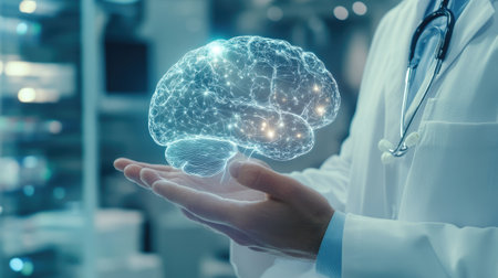 Selective focus of A doctor in a white coat holds out his hand with a glowing holographic brain model on his hand. In the background is a medical laboratory.