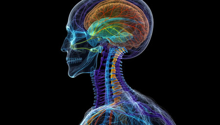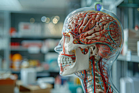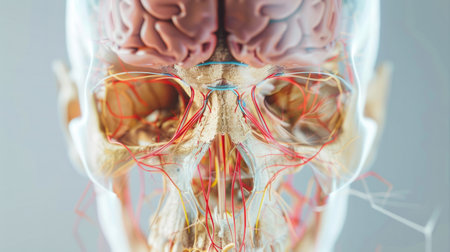 Depiction of human anatomy highlighting cranial and vascular systems with intricate detail and vibrant colors against a dark background