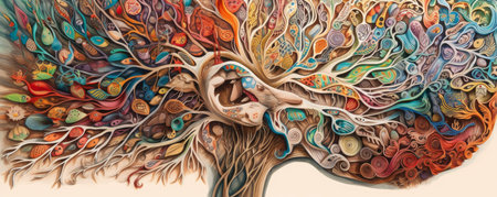 A vibrant, abstract painting of a tree with branches spreading outwards, creating a colorful and intricate design