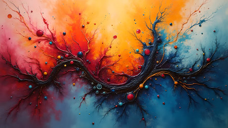 Abstract artwork featuring a vibrant, colorful neural network pattern. Intricate branching structures create a unique design.